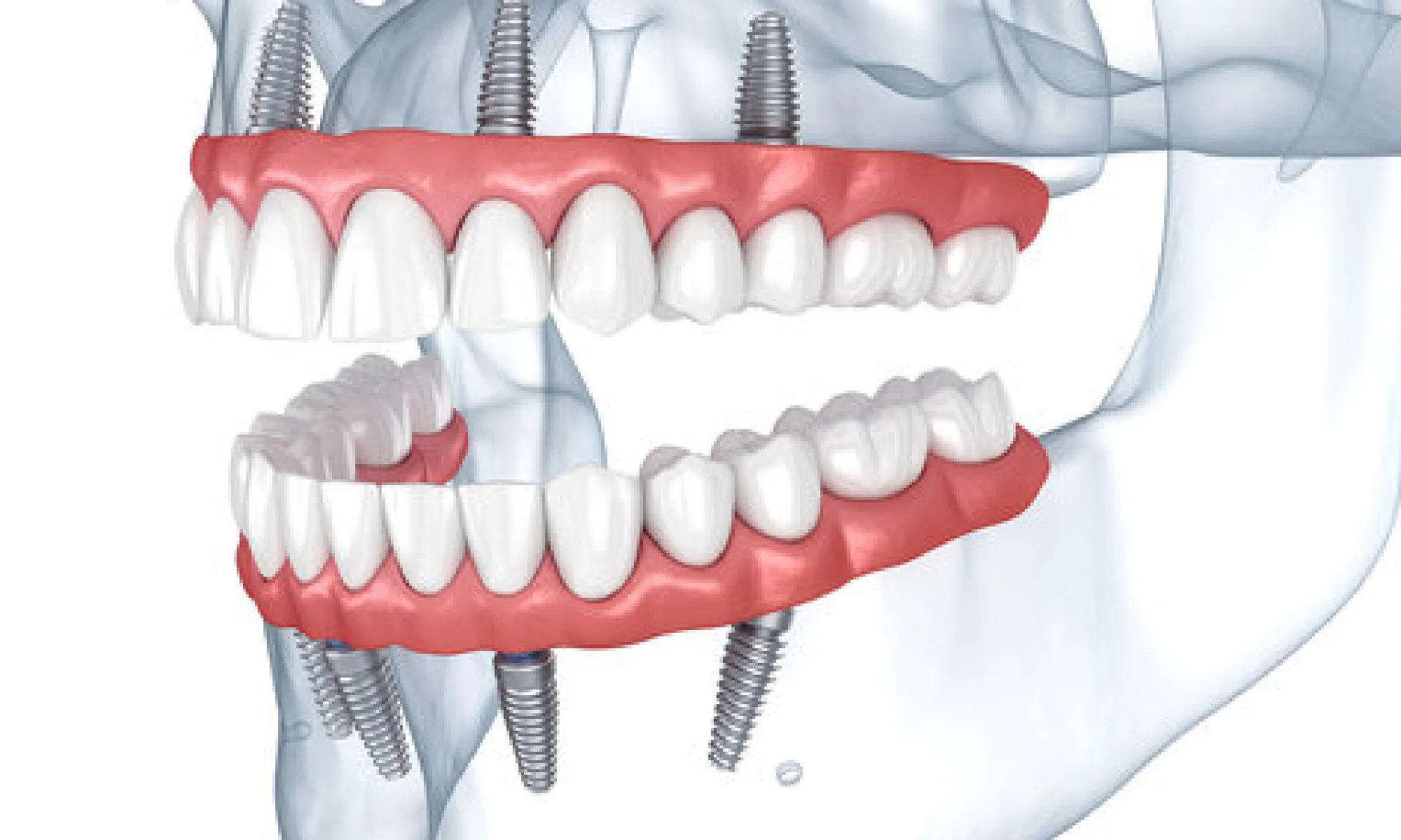 All-on-4(オール・オン・フォー)とは、最小4本のインプラントで人工の歯を支え、12本分の歯の働きを実現できます。しっかりとした仮歯の装着まで、1日で行うことが可能です。午前中に施術の場合、夕食もやわらかいものであれば召し上がって頂くことが出来ます。(※症例により個人差もあるため、出来ない場合もあります) 現在、総入れ歯を装着されている方や、歯周病などにより残存する健全歯では十分に咀嚼することが困難な方に対して、少ない本数のインプラントで、自分の歯と同じようにしっかり咬める義歯をインプラント上に固定し、咀嚼機能の改善を行う方法です。