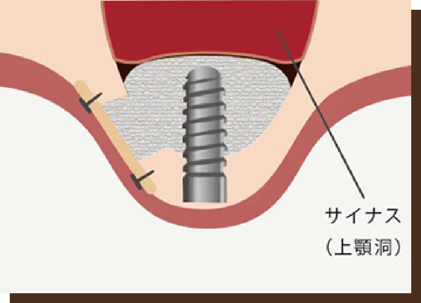 上顎の奥歯の骨の量が足りず治療ができない場合に行う方法です。上顎の下から穴を開け、隙間を作り、再生療法や骨移植などで骨の量を補う方法です。
